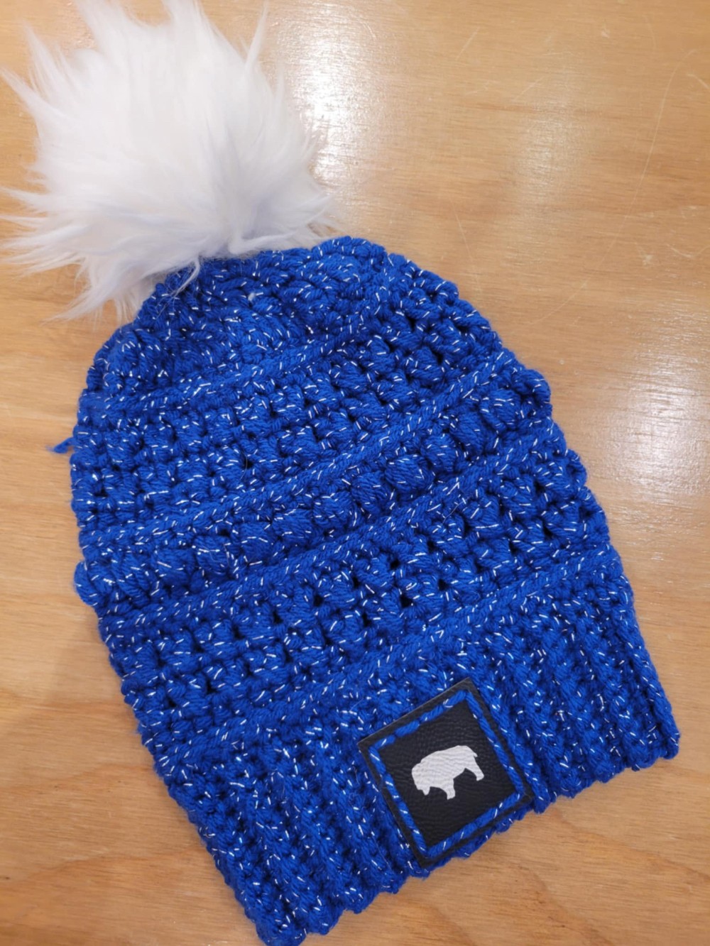 Royal blue sparkle hometown hats with the option of a white or black Pom Pom. Spot clean or hand wash then lay flat to dry for best results